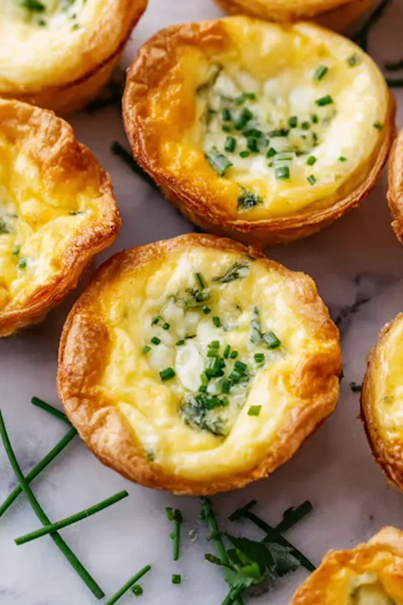 These little savory bites bring all the comfort of a traditional quiche in a convenient, party-ready size. A flaky crust cradles a creamy egg filling loaded with melted cheese and simple seasonings.