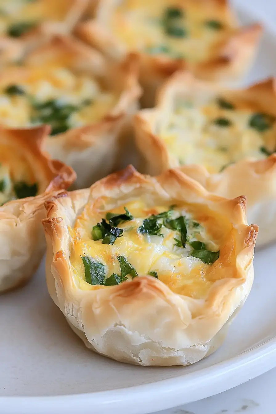 For the best texture, let these mini quiches cool in the pan for 5 minutes before removing them (a butter knife around the edges helps), and serve them while they’re still warm for the perfect balance of crispy wrapper and creamy filling.