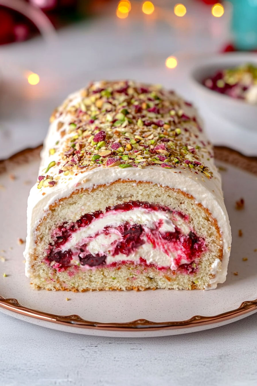 Today, I’m sharing a delightful recipe for pistachio raspberry yule log cake.