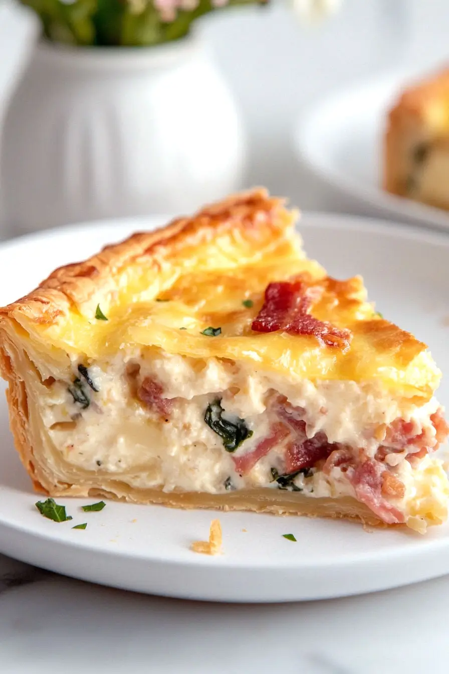 This rich and savory quiche pairs perfectly with a fresh green salad dressed in a light vinaigrette – the crisp lettuce and tangy dressing help balance out the creamy, buttery filling. For brunch, I like to add some fresh fruit on the side, like mixed berries or sliced melon, which adds a sweet contrast to the salty bacon and cheese. If you’re serving this for dinner, consider adding some roasted vegetables like asparagus or French green beans, which complement the French-inspired flavors of the dish. A glass of crisp white wine, like Sauvignon Blanc or Chablis, makes this meal feel extra special.