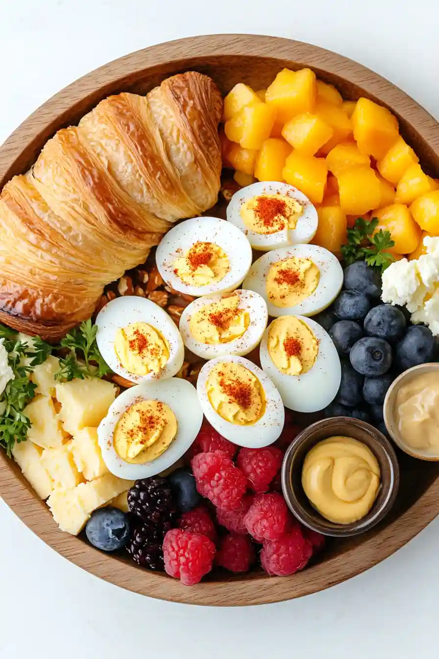 The biggest challenge when assembling a deviled eggs charcuterie board is timing – preparing the deviled eggs too far in advance can lead to a dry, rubbery texture, so aim to make them no more than 4-6 hours before serving and keep them covered in the refrigerator. Getting the temperature right is crucial – remove your board ingredients from the fridge about 20-30 minutes before serving, as cold cheese and meats won’t have their full flavor (but don’t leave deviled eggs at room temperature for more than 2 hours for food safety). To prevent your board from looking messy, start by placing your larger items like croissants and deviled eggs first, then fill in gaps with smaller items like berries and dried fruit – this creates natural sections and makes it easier for guests to navigate the spread. For the best presentation, keep your dips and spreads in small, separate bowls rather than letting them touch other ingredients, and remember to provide serving utensils for each section to avoid cross-contamination.