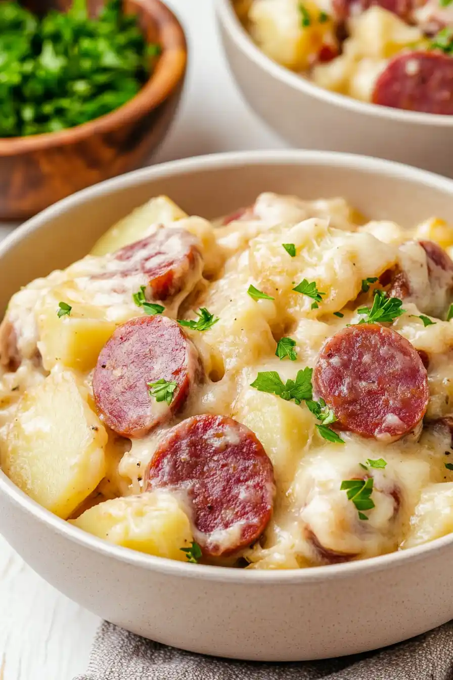 - Hearty comfort food – The combination of creamy cheese sauce, smoky kielbasa, and tender potatoes makes this the perfect filling dinner for cold evenings.