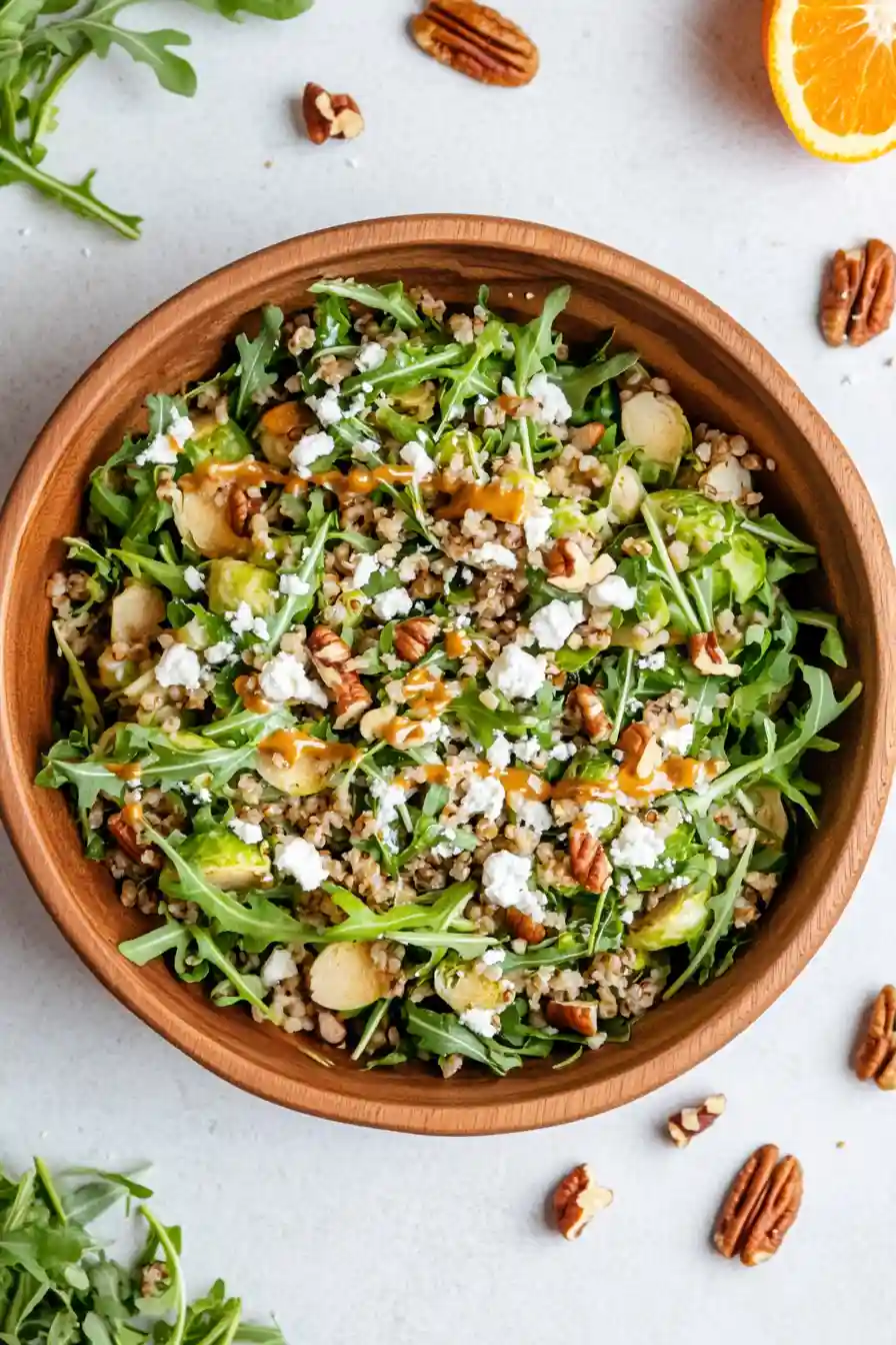 In a large bowl, combine the cooled farro with arugula, shredded Brussels sprouts, and pecans.