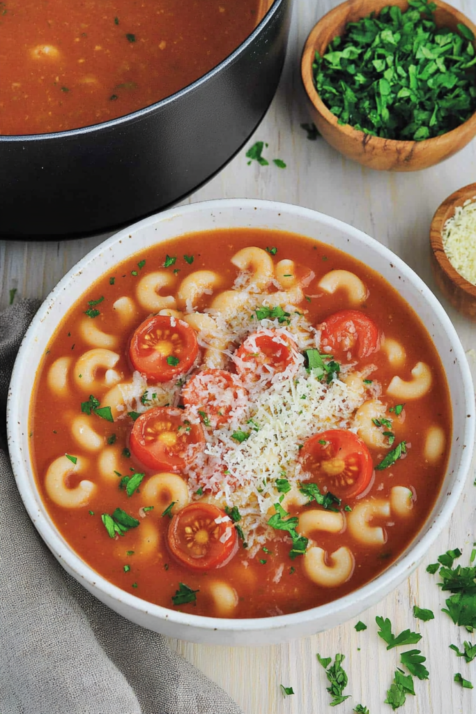 Serve the soup in bowls, garnishing each serving with vegan Parmesan and fresh basil.