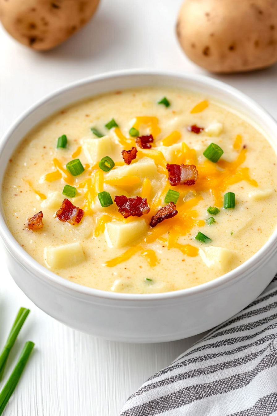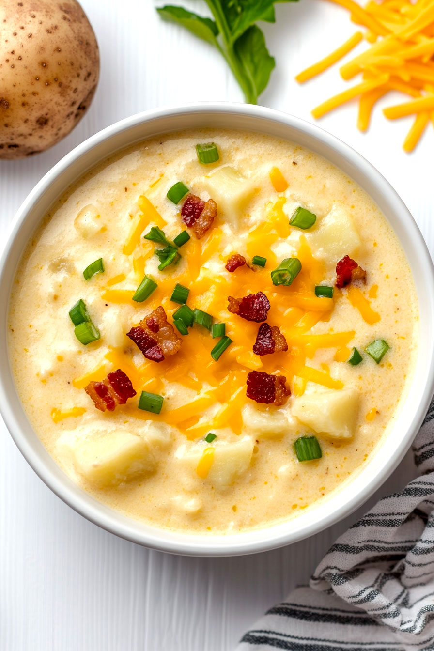 Add your favorite potato soup toppings, such as chopped chives, crispy bacon bits, or a dollop of extra sour cream, for additional flavor and enjoyment.