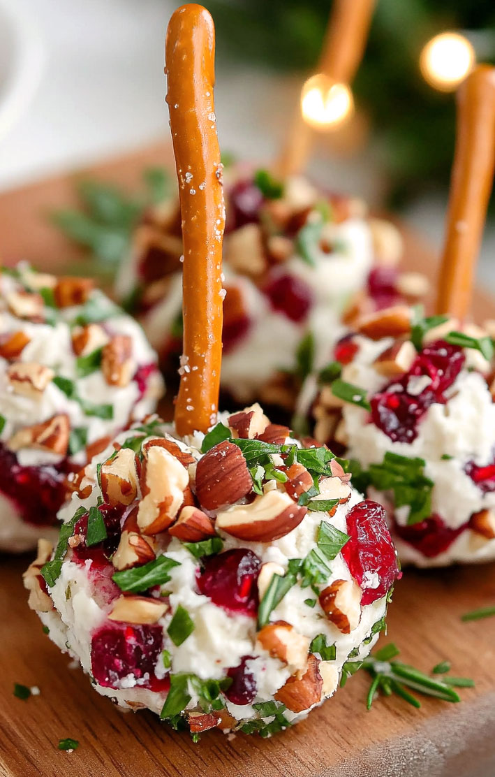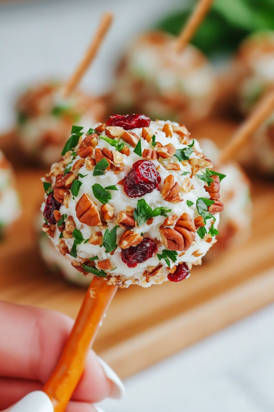 Prior to serving, insert a pretzel stick into the center of each cheese ball, which will make them easy to pick up and enjoy.
