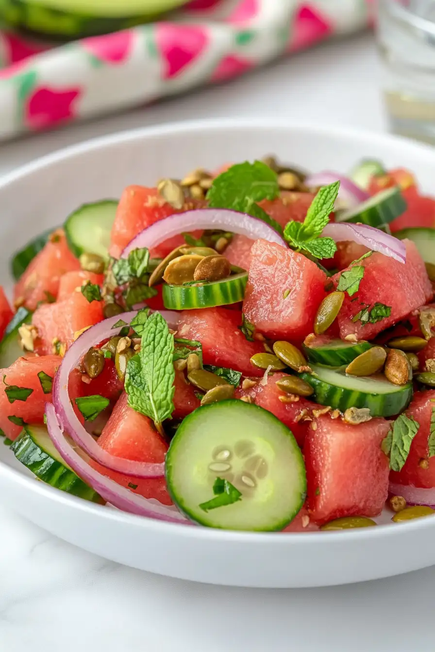 The biggest challenge when preparing this Mexican watermelon salad is timing – cutting the watermelon and cucumber too far in advance can lead to a watery mess, so it’s best to prepare these ingredients just before serving. Another common mistake is not properly draining the red onions after slicing – soaking them in cold water for 10 minutes helps remove their sharp bite and makes them more pleasant to eat. When seasoning the salad, avoid adding all the spices at once; instead, start with half the recommended amount of cayenne and chili powder, then taste and adjust according to your heat preference. For the crunchiest pepitas, make sure to let them cool completely before adding them to the salad, and store any leftover pepitas in an airtight container to maintain their texture.