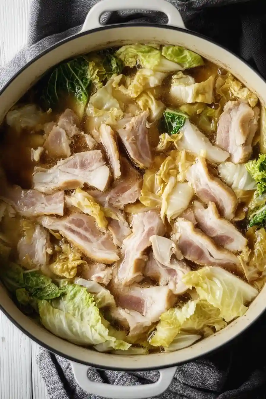Once arranged, you’re ready to proceed with cooking, ensuring the broth from Step 1 will infuse the cabbage and pork layers during the heat process.