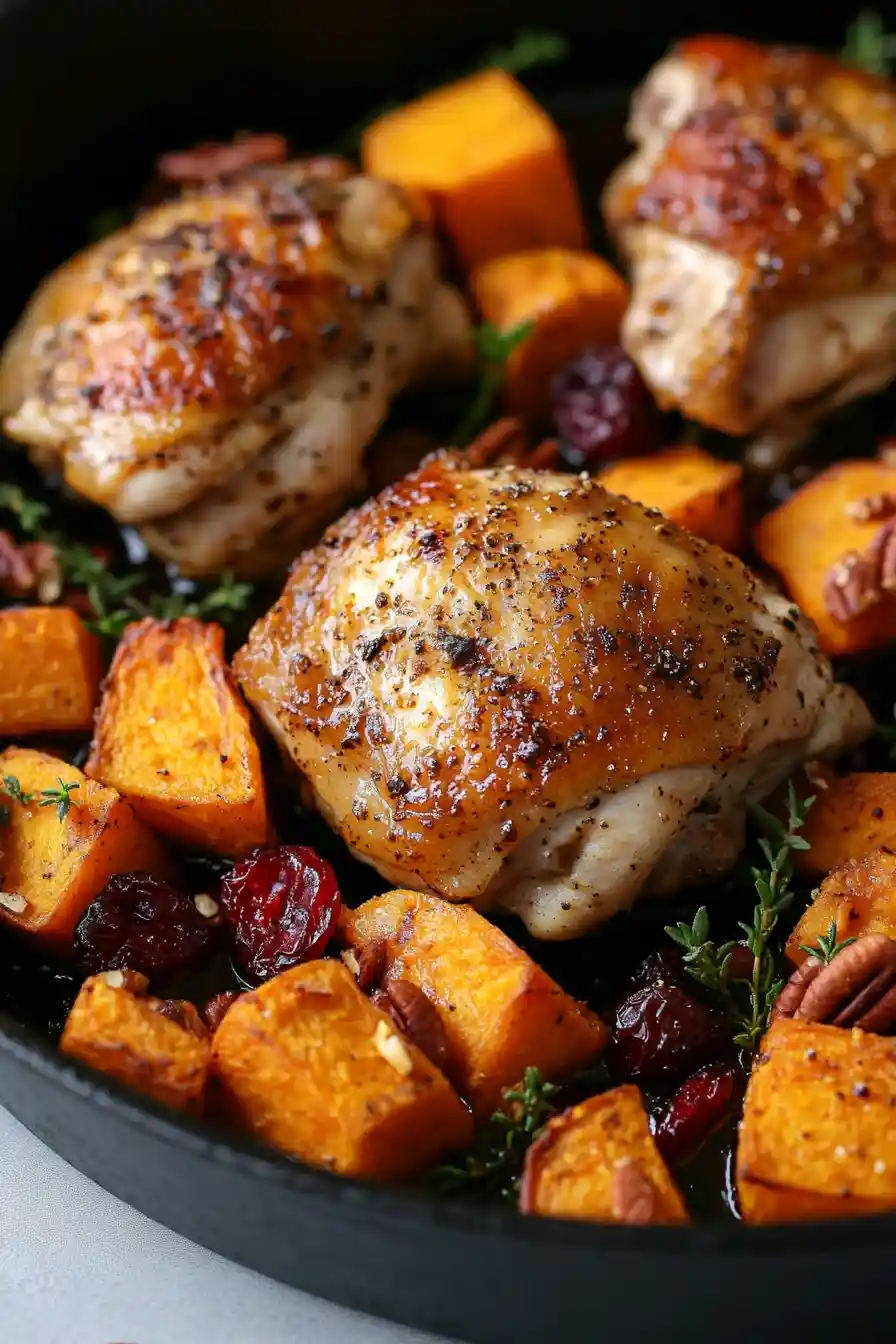 Serve the dish hot, ensuring each serving gets a bit of chicken, sweet potatoes, and the cranberry-pecan mixture.