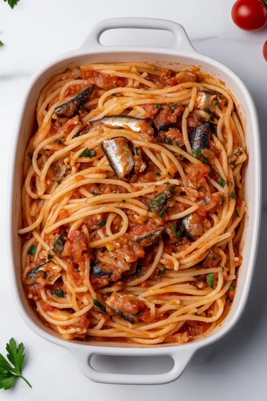 Since this pasta dish is rich and filling, it pairs really well with light, fresh sides that can balance out the savory flavors. A simple green salad with lemon vinaigrette works great – the bright, citrusy dressing helps cut through the richness of the sardines and complements the tomato sauce. If you want to add some vegetables, roasted broccoli or sautéed green beans are excellent choices that won’t overwhelm the main dish. For an extra Mediterranean touch, serve some warm crusty bread on the side to soak up any remaining sauce from your plate!