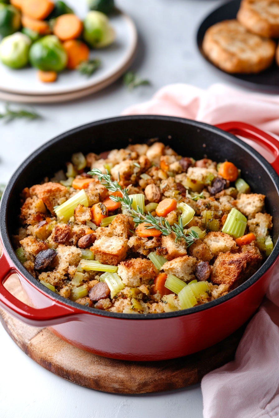 For a gluten-free option, replace bread cubes with a mixture of gluten-free bread and quinoa or wild rice. This substitution maintains the stuffing’s texture while adding nutritional value. Adjust the amount of veggie broth as needed to achieve the desired moisture level. Avocado oil can be substituted with olive oil or melted coconut oil for different flavor profiles and health benefits. Use the same amount as called for in the recipe. Chestnuts can be replaced with roasted and chopped hazelnuts or pecans for a similar nutty flavor and texture. This substitution works well for those with chestnut allergies or when chestnuts are unavailable. Use an equal amount of nuts as the chestnuts called for in the recipe.