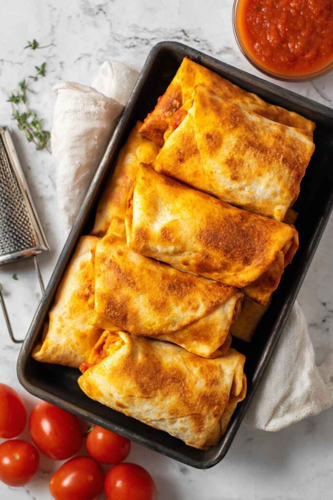 Toast in a preheated oven at 200°C (400°F) for 8–10 minutes, or air fry at 180°C (350°F) for 8–10 minutes, until the wraps are crispy and the cheese is melted.