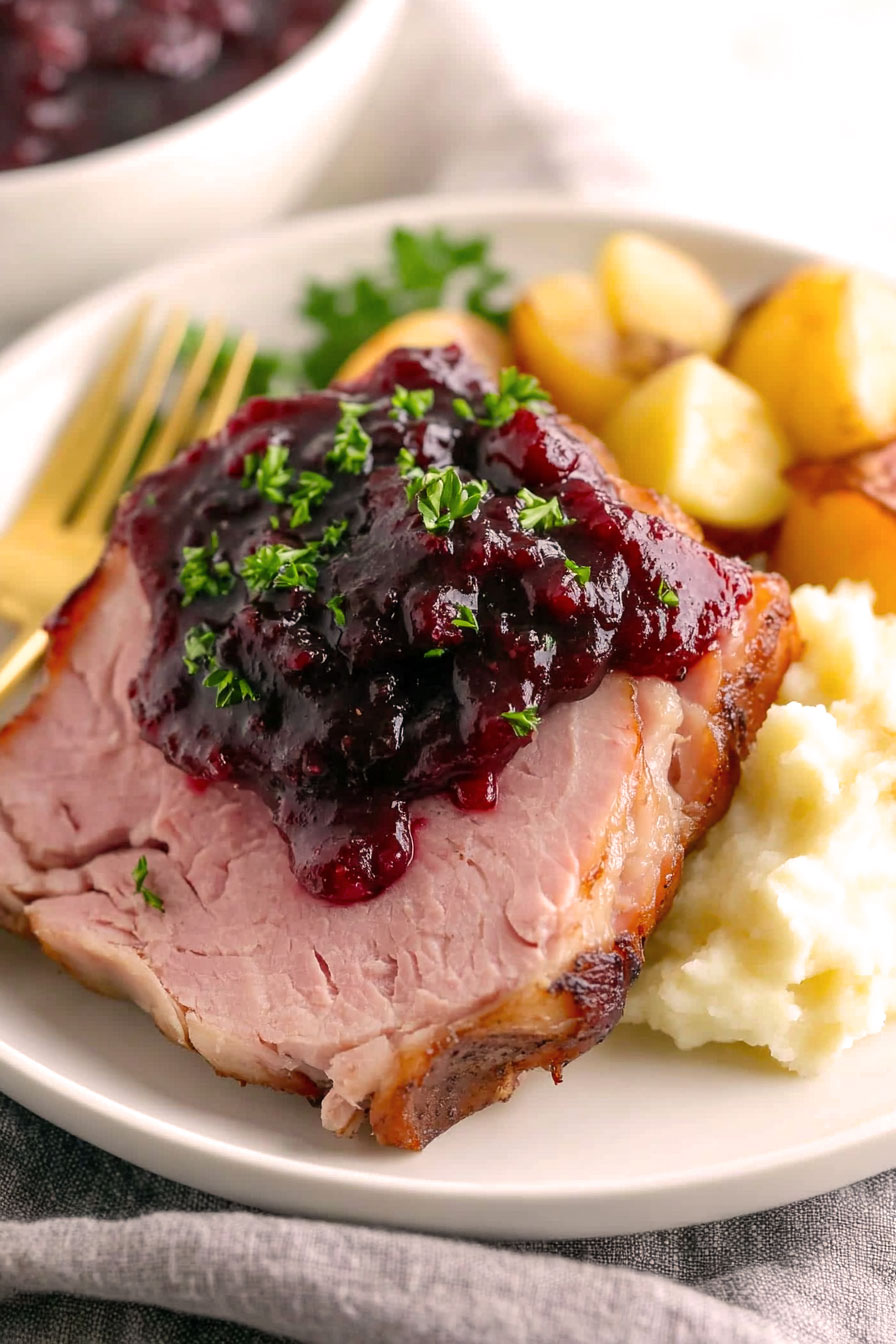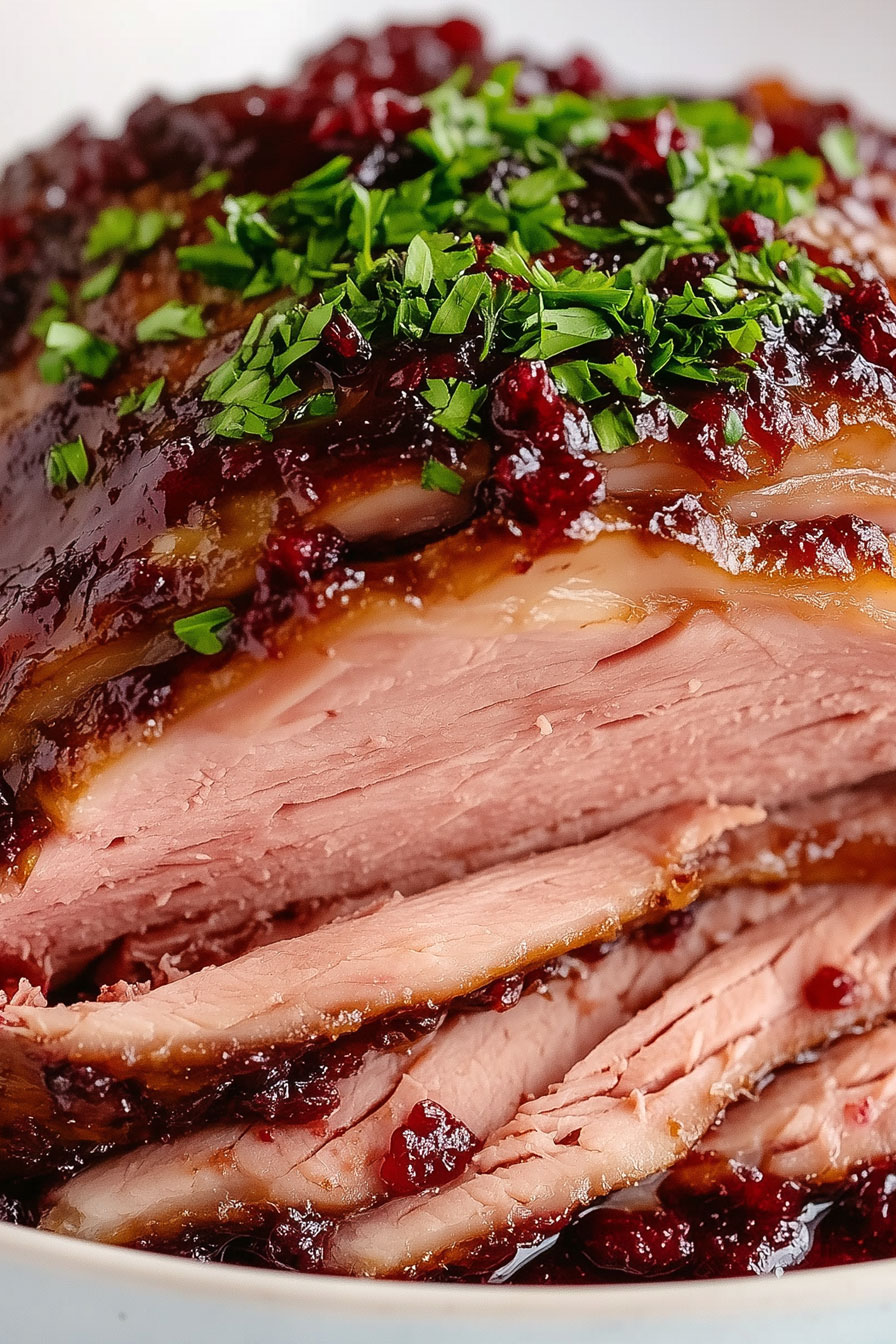 Spoon about ½ cup of the prepared cranberry glaze over the ham, ensuring it is evenly coated.