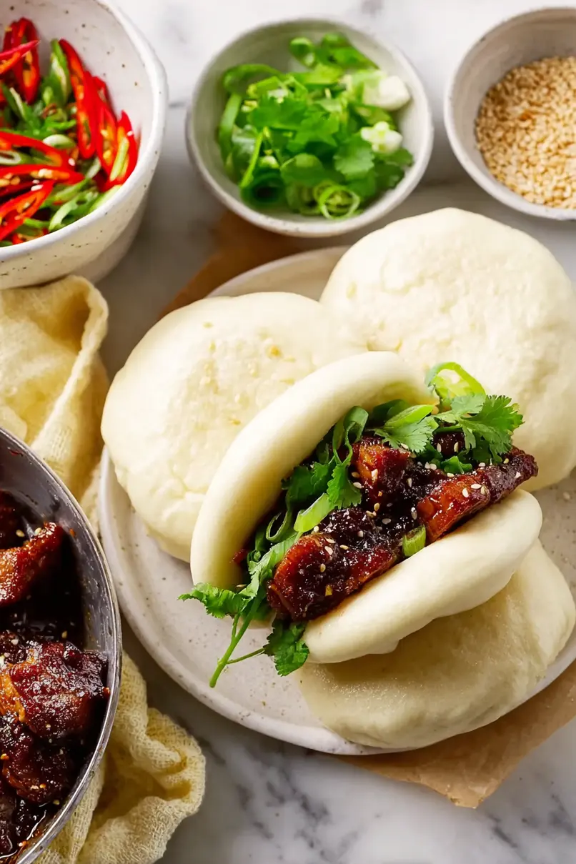 The success of your bao buns heavily depends on the dough temperature and proofing time – cold dough won’t rise properly, so ensure all your ingredients are at room temperature before starting, and let the dough proof in a warm spot (around 75-80°F) for the full time specified. When cooking the pork belly, a common mistake is rushing the braising process – low and slow is key here, as cooking too quickly will result in tough, chewy meat instead of that melt-in-your-mouth texture we’re after. The bao buns themselves can become dense and chewy if you overwork the dough, so mix just until the ingredients are combined and stop kneading as soon as the dough becomes smooth and elastic. For the best texture, avoid overcrowding your steamer basket – leave enough space between the buns for them to expand during cooking, and never let the boiling water touch the bottom of the buns while steaming.
