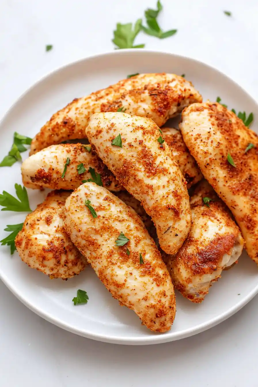 These seasoned chicken tenders are super flexible when it comes to side dishes! For a quick weeknight dinner, I like to serve them with a simple side salad and some roasted potatoes or sweet potato fries. If you’re looking to add more veggies to your plate, steamed broccoli or roasted green beans work really well with the smoky-sweet seasoning blend on the chicken. Since these tenders aren’t breaded, they’re perfect for topping rice bowls or serving over quinoa with your favorite sauce drizzled on top – I especially like honey mustard or ranch dressing for dipping.