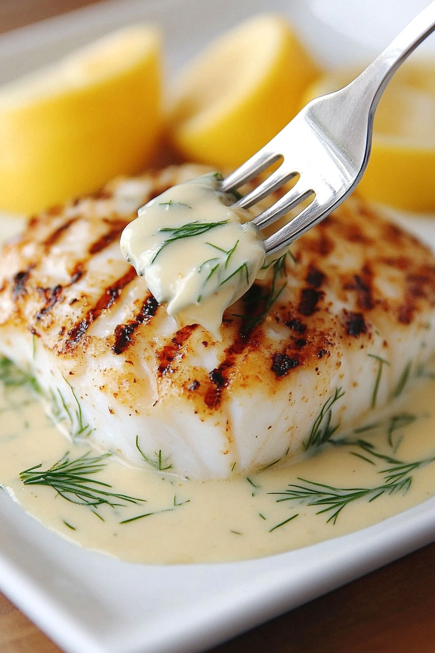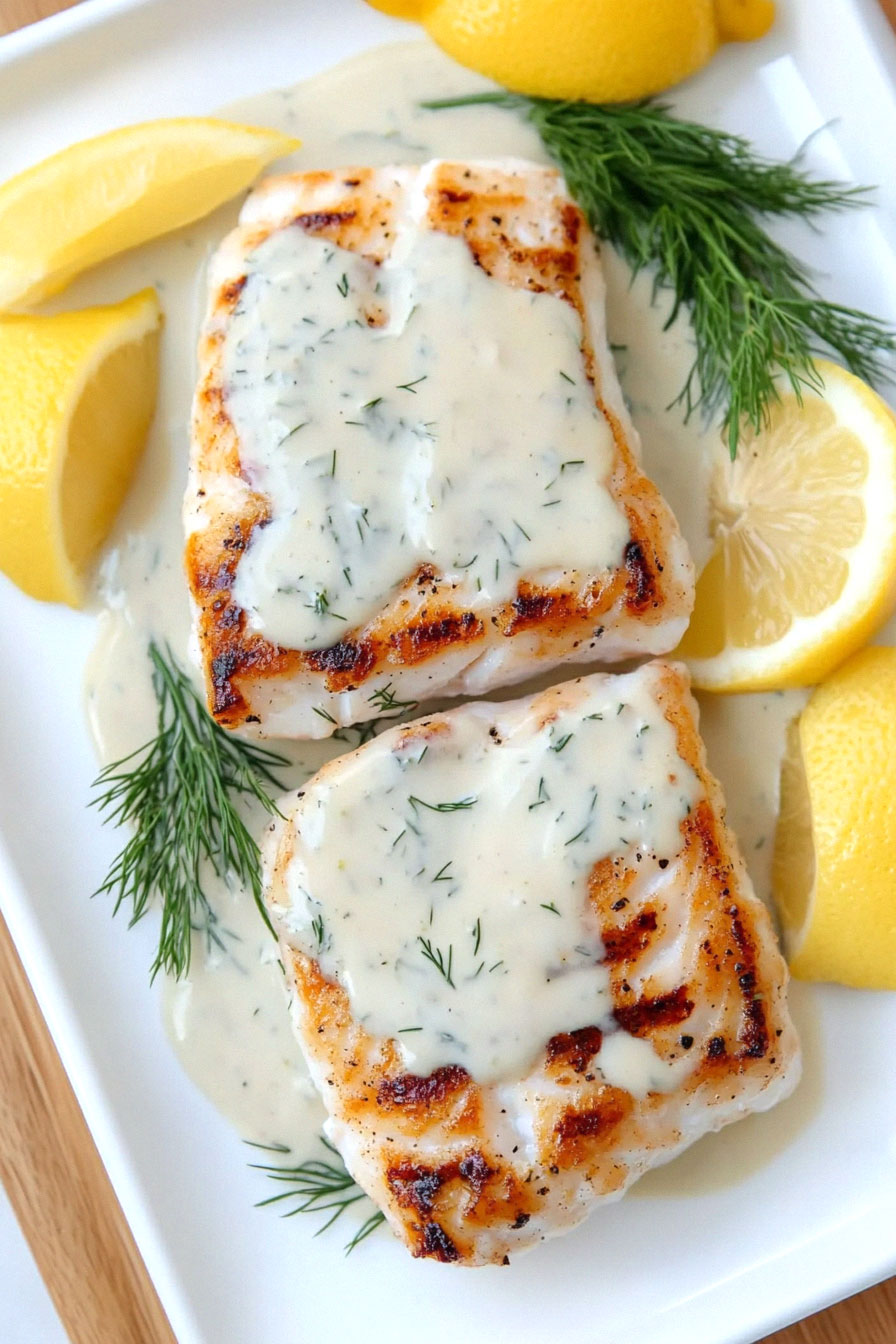 Plate the grilled haddock and drizzle with the creamy lemon-dill sauce.
