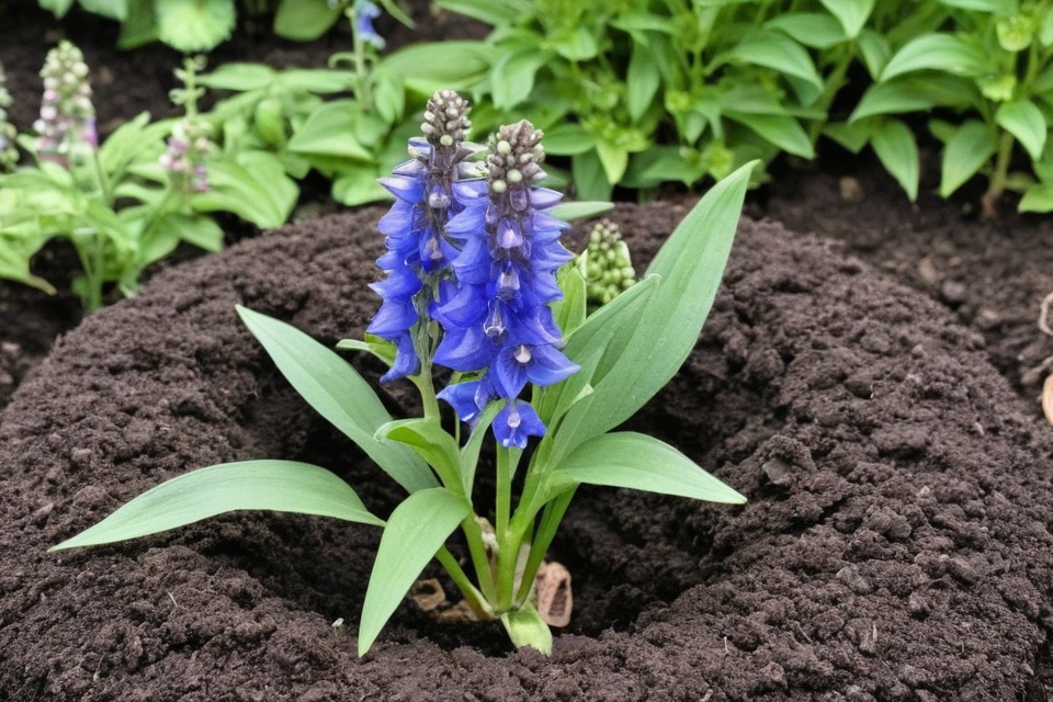 Your delphiniums will thank you if you put in some effort here. Mix in some compost or well-rotted manure to enrich the soil.