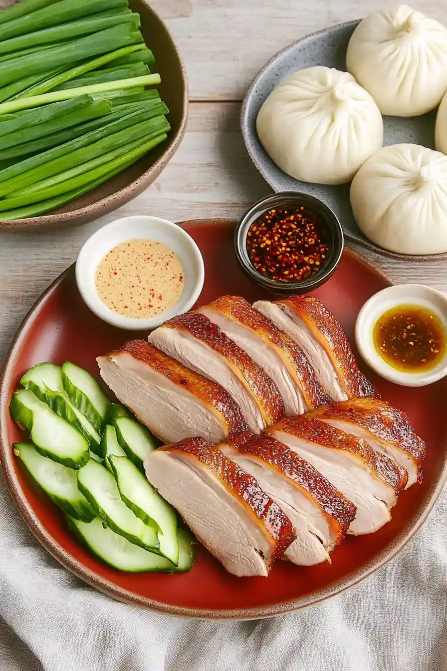 This Chinese roasted duck pairs perfectly with traditional accompaniments like thin Mandarin pancakes or fluffy steamed buns, which are perfect for wrapping up pieces of duck with some crisp scallions and cucumber. A side of steamed white rice or vegetable fried rice helps soak up all those tasty juices and sauce. For vegetables, try serving some simple stir-fried bok choy or Chinese broccoli with garlic – these greens provide a nice balance to the rich duck meat. You can also put out some extra hoisin sauce, sliced green onions, and julienned carrots so everyone can build their own perfect bite.