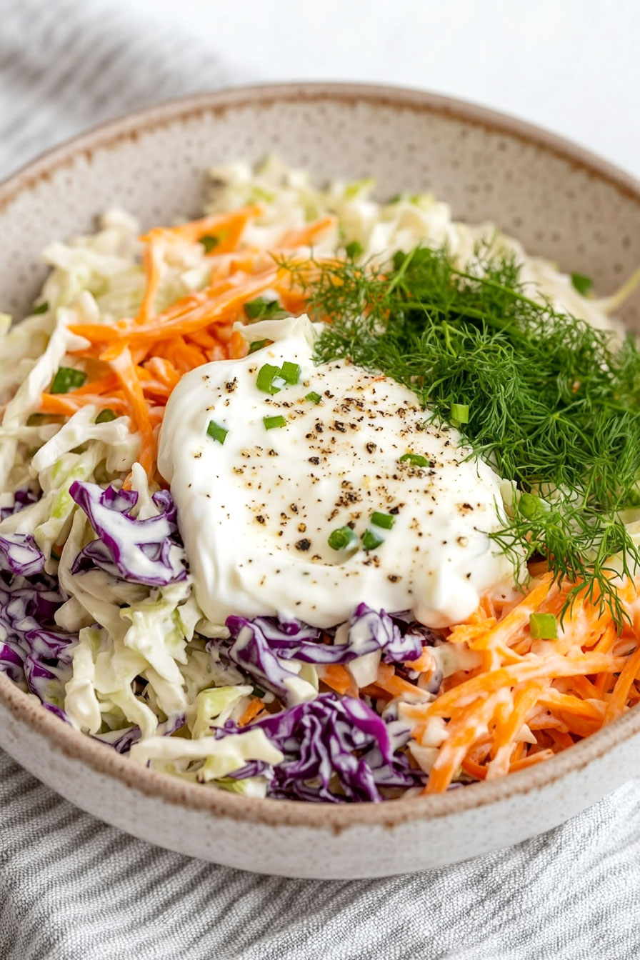 In a large bowl, add a 1 lb bag of coleslaw mix, 1/4 cup of finely chopped dill or parsley (optional), 3/4 cup Greek yogurt, 1/4 cup mayo, 3/4 teaspoon salt, and ground black pepper to taste.