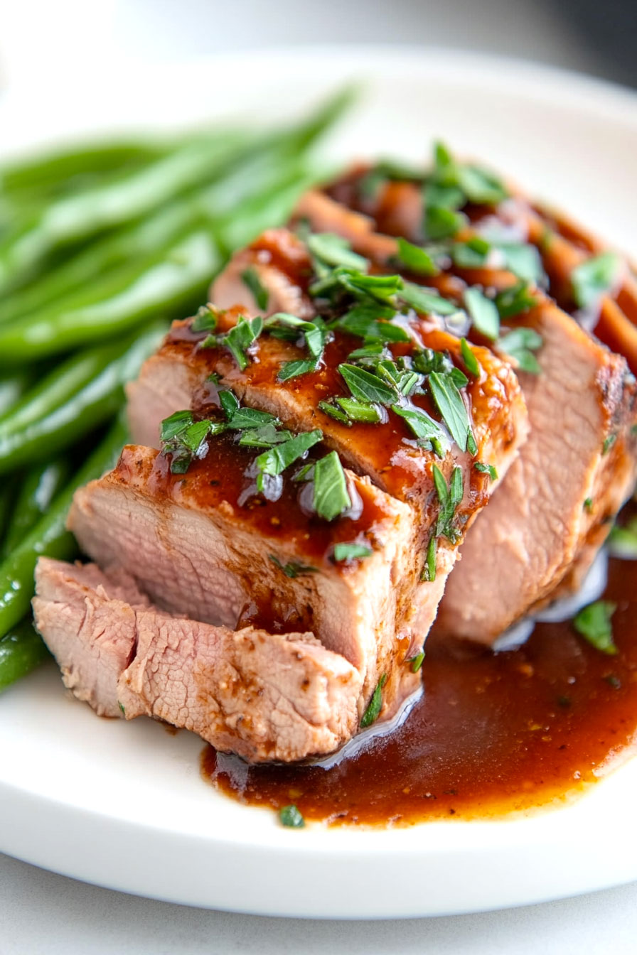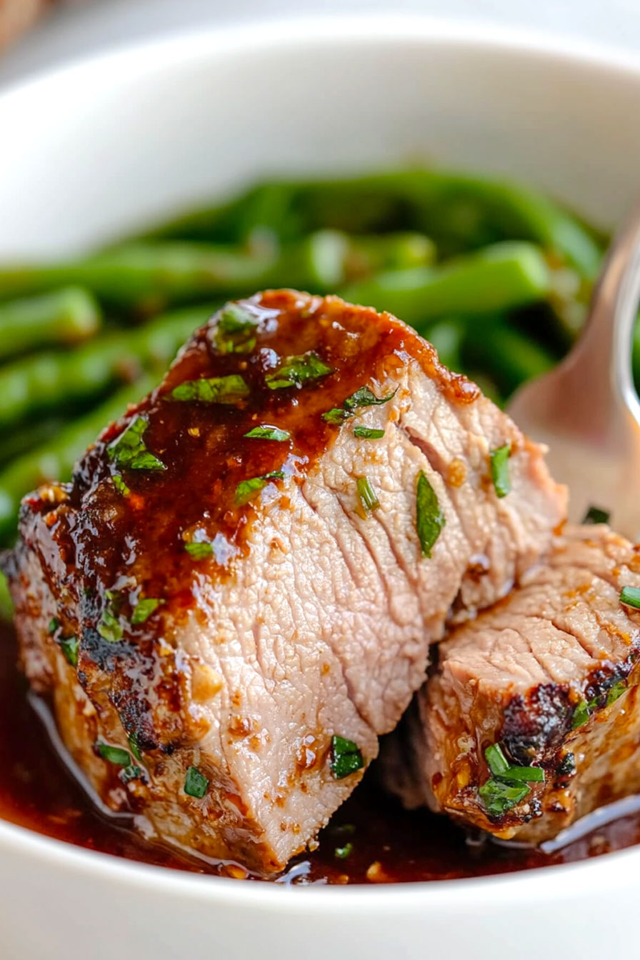 After the pork has rested, slice it crosswise into ½-inch thick pieces.