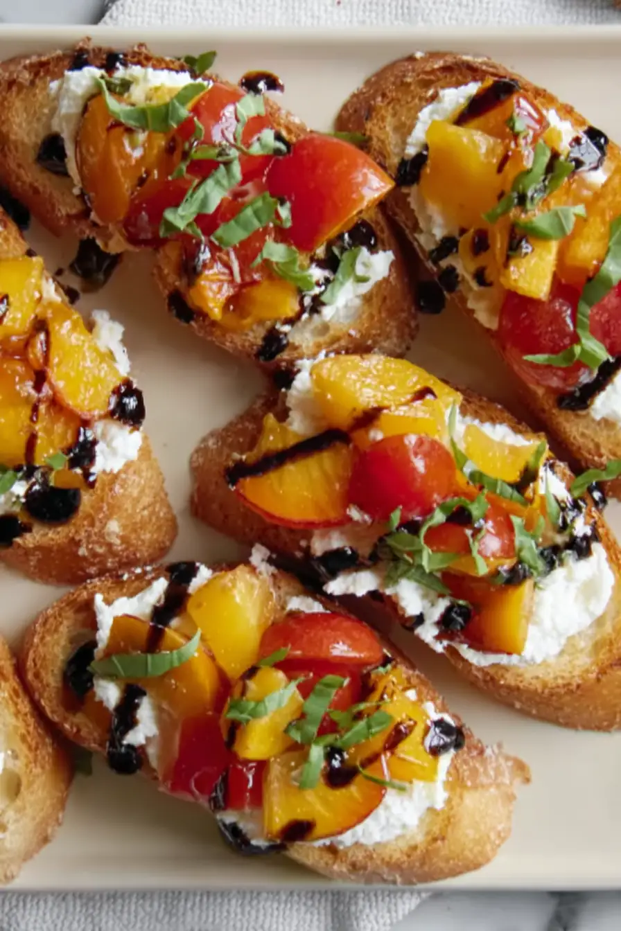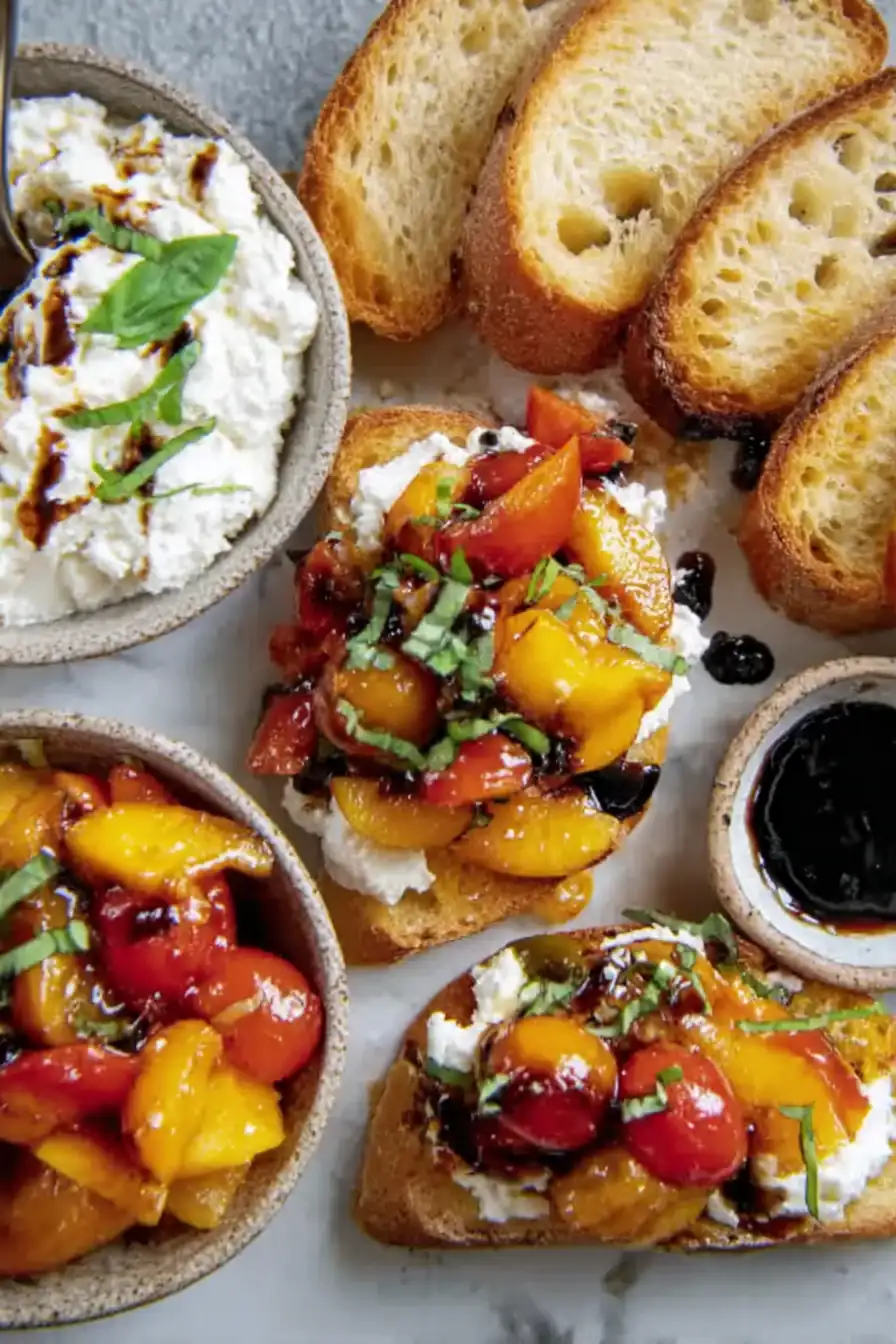 This fresh and summery peach bruschetta makes a perfect appetizer, but you can easily turn it into a light meal with a few simple additions. Try serving it alongside a crisp arugula salad dressed with just olive oil and lemon juice to match the bright flavors of the bruschetta. For a more substantial spread, add a platter of Italian meats like prosciutto and salami, which pair wonderfully with the sweet peaches and creamy ricotta. Since this dish already has a good mix of flavors, keep your drink pairing simple – a chilled glass of prosecco or a light pinot grigio would be just right.
