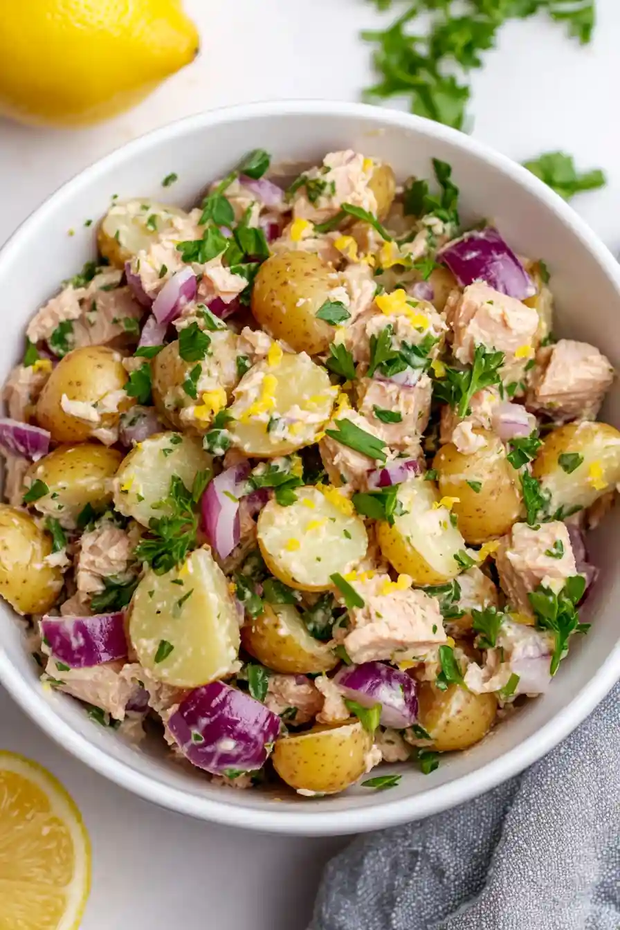 In a large serving bowl, combine the cooled potatoes, drained tuna, and the prepared lemon dressing.