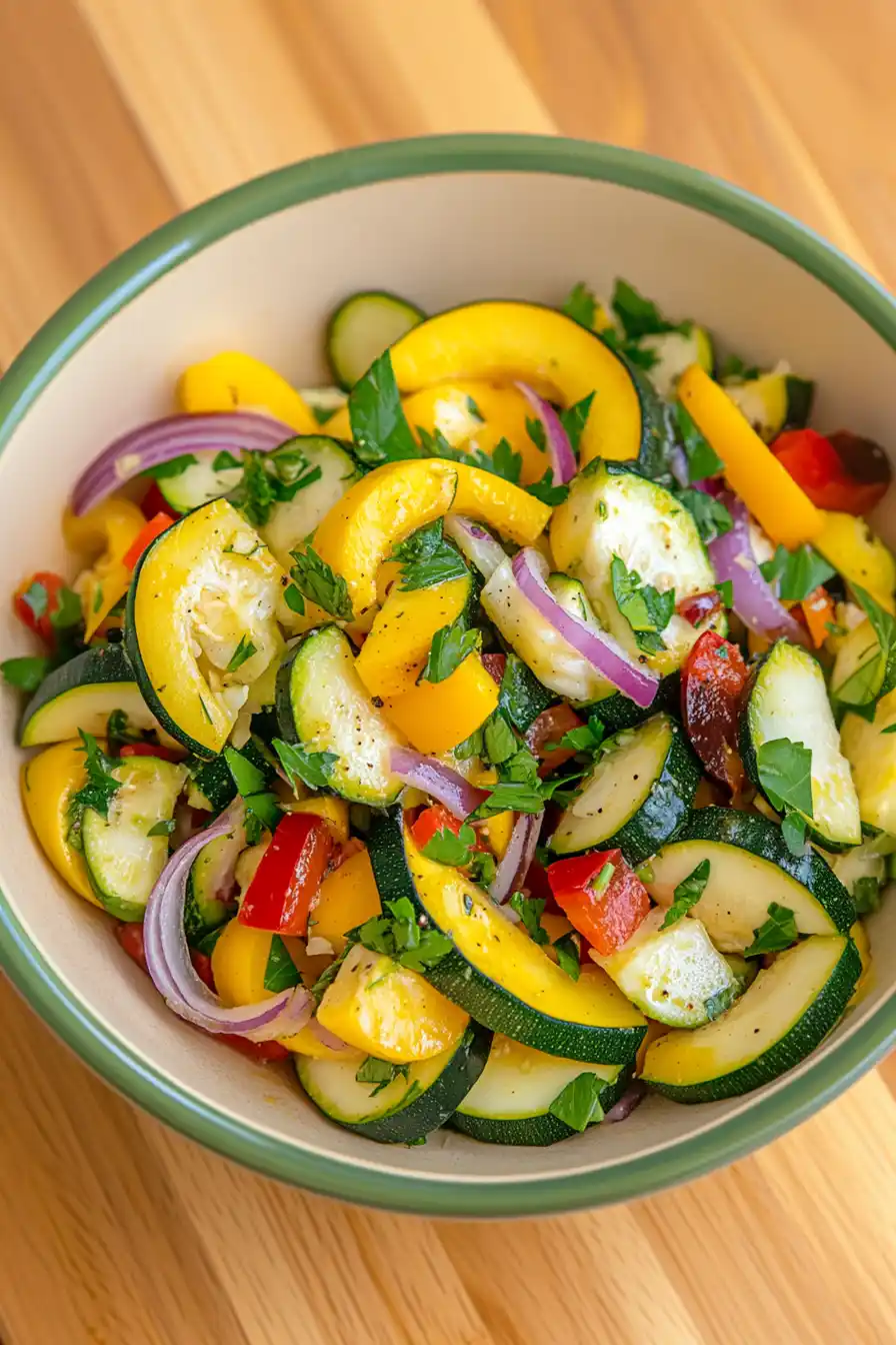 Keep Fresh: This zucchini and yellow squash salad tastes best when eaten within 24 hours, but you can keep it in an airtight container in the fridge for up to 3 days. The vegetables might release some liquid over time, but that’s totally normal – just give it a quick toss before serving.