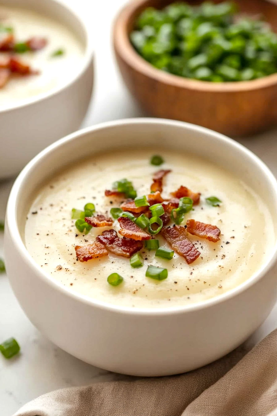 Potatoes can be partially or fully replaced with cauliflower for a lower-carb version. Steam or boil cauliflower florets until tender, then blend with the other ingredients. This substitution reduces the overall carbohydrate content while adding more fiber and nutrients. Use about 1 medium head of cauliflower to replace half the potatoes, adjusting the liquid as needed for desired consistency.