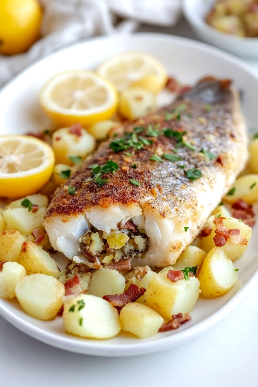 Enjoy the perfectly baked stuffed fish with crisp bacon and sides.