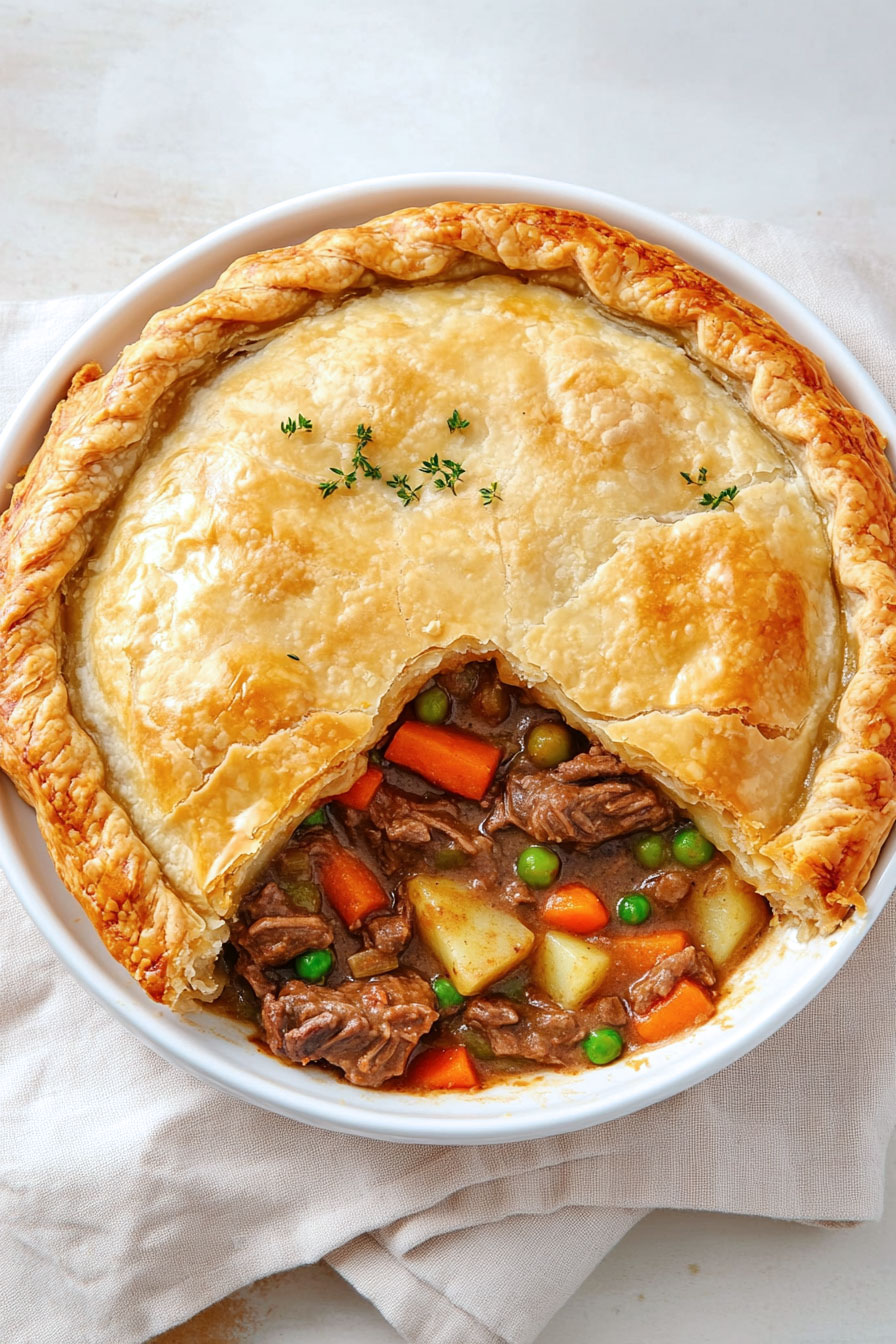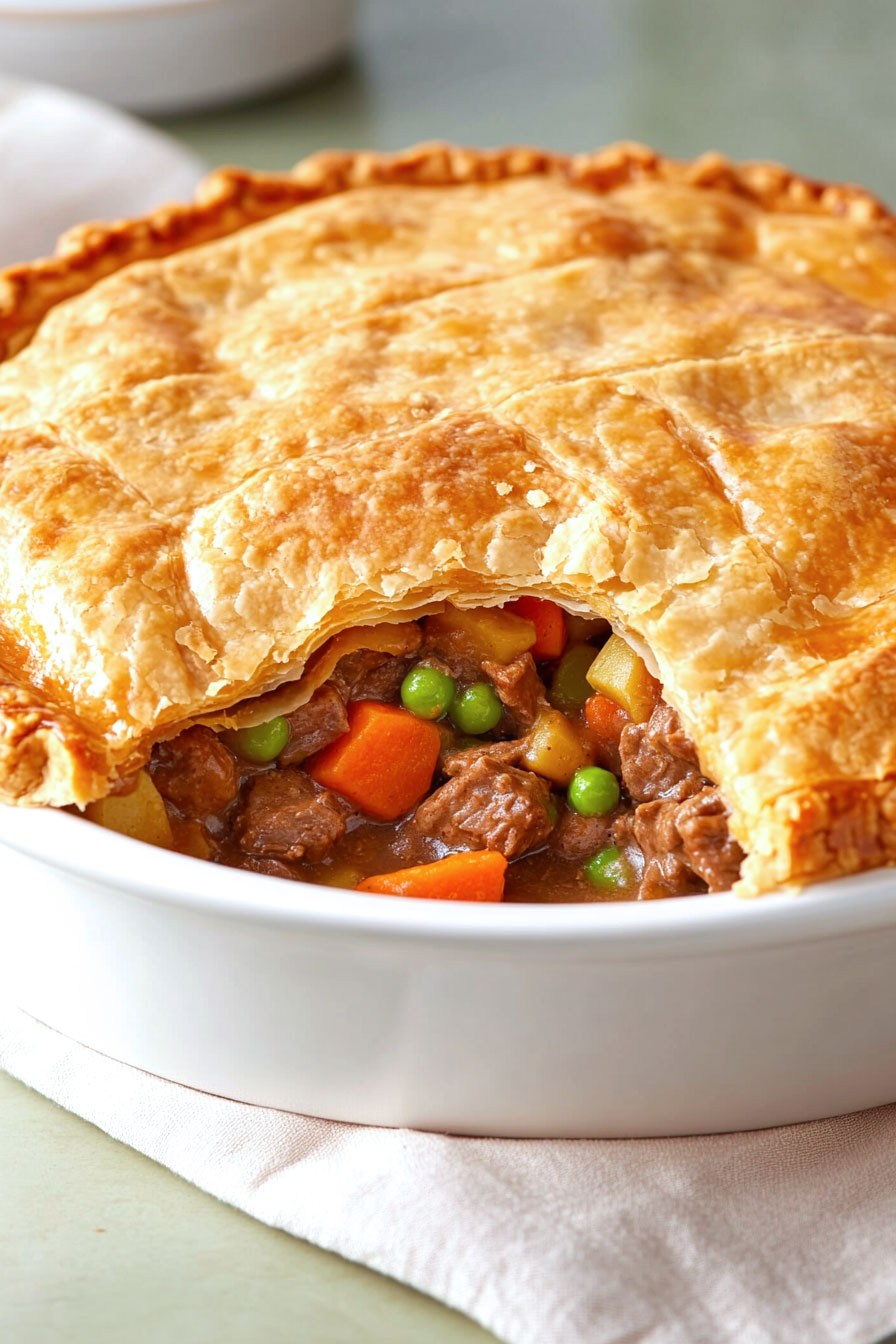 Enjoy your homemade beef pot pie with its savory filling and crispy crust!