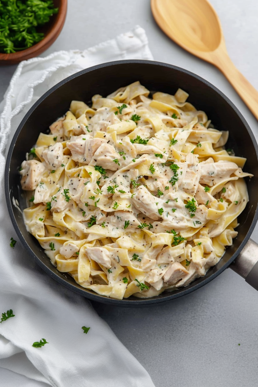 Extra wide egg noodles can be swapped with zucchini noodles or shirataki noodles for a low-carb option. Zucchini noodles will cook faster, so add them near the end of the cooking time. Shirataki noodles should be rinsed and drained before adding to the dish. Both alternatives will significantly reduce the carbohydrate content of the meal.