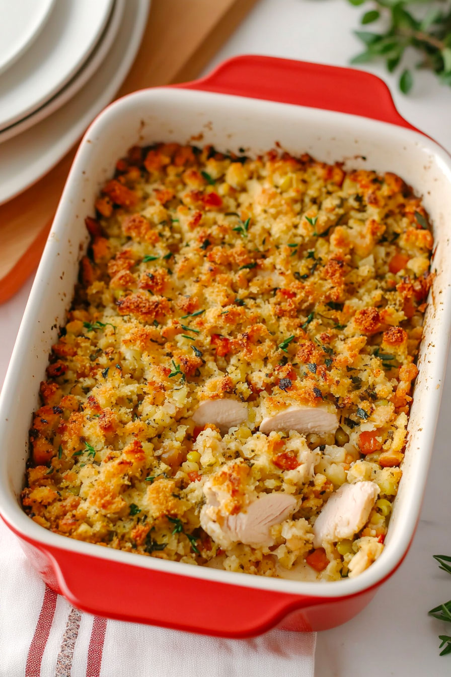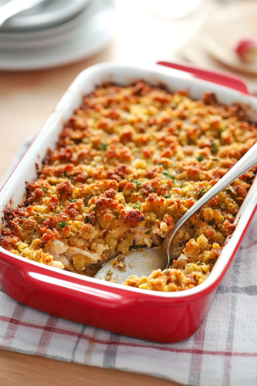 Bake the assembled casserole in the preheated oven for about 1 hour, or until the filling is bubbly and the stuffing topping is a golden brown.