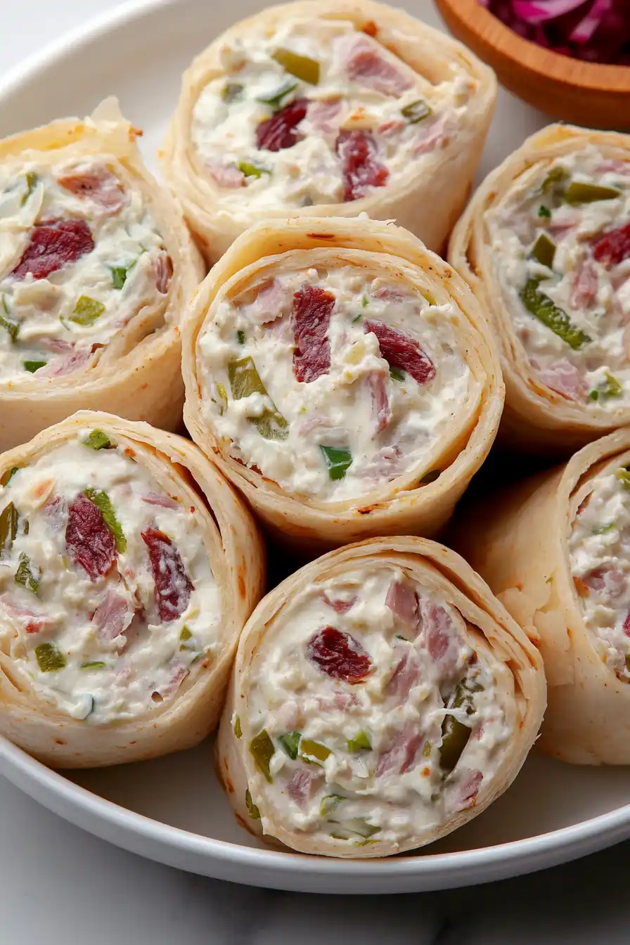 These creamy, savory tortilla roll ups are perfect for parties and potlucks, and they pair really well with a variety of simple sides. A fresh veggie platter with crisp carrots, celery, and bell peppers adds nice crunch and balances out the richness of the cream cheese filling. For a casual gathering, serve them alongside some potato chips or pretzels – the salty crunch is a great match for these creamy bites. If you’re hosting a bigger spread, these roll ups fit right in with other party favorites like deviled eggs, fresh fruit, or a simple green salad.