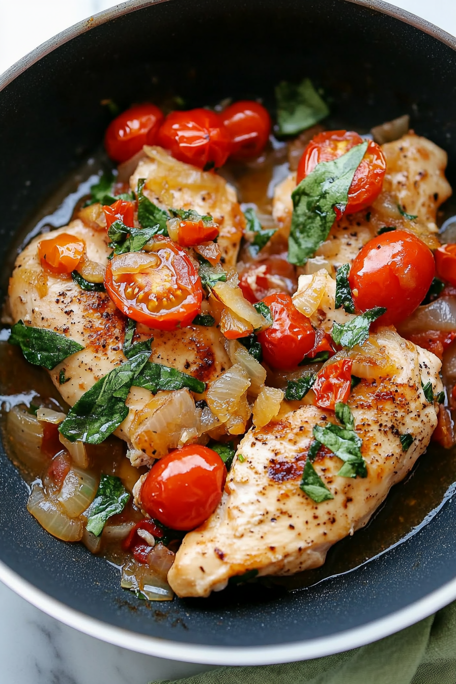 Today, I’m sharing my go-to recipe for chicken breast with onions and tomatoes.
