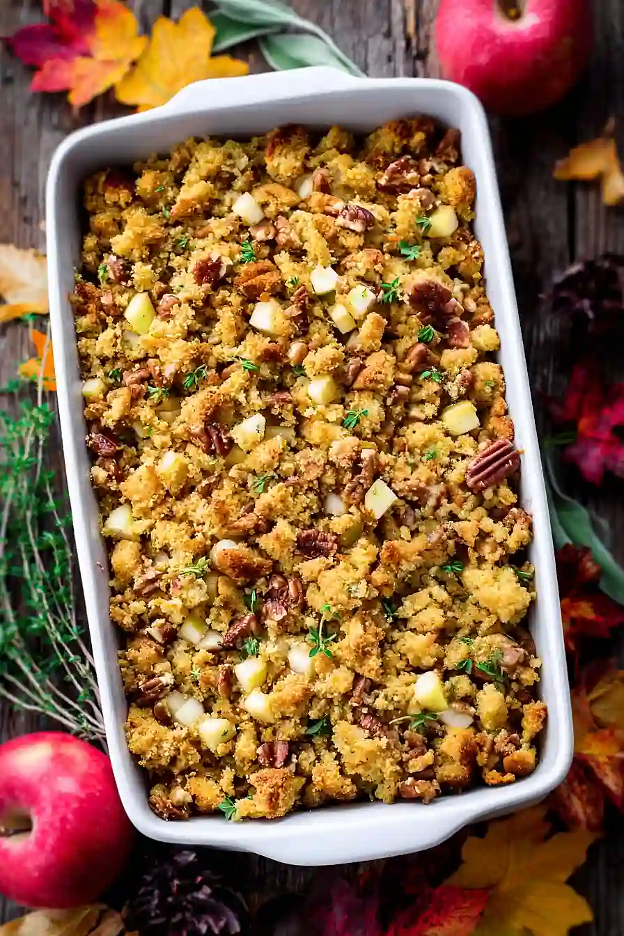 This cornbread apple stuffing is perfect alongside roasted turkey or chicken, especially during the holidays when you want that classic comfort food spread. The sweet apples and savory herbs also pair really well with pork tenderloin or ham, since the fruity flavors complement those meats nicely. If you’re going for a full Thanksgiving-style meal, serve it with cranberry sauce, roasted Brussels sprouts, and mashed potatoes for the complete experience. For a lighter option, try it with a simple roasted chicken and some steamed green beans to let the stuffing’s apple and pecan flavors really shine.