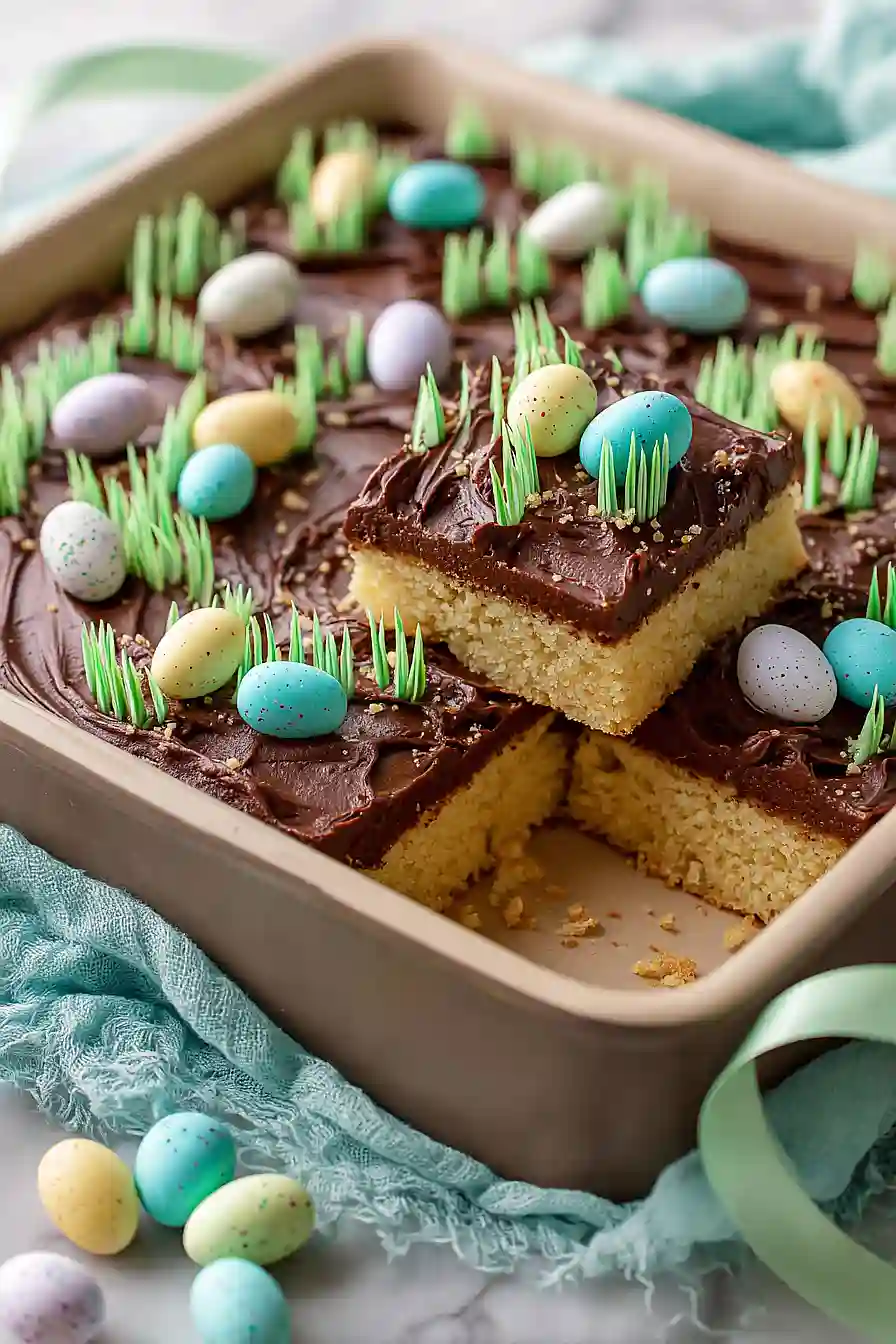 They’re finished with crushed chocolate cookies for “dirt,” green Easter grass, and colorful candy eggs on top. No cookie cutters or rolling pins needed—just spread the dough in a pan and bake.