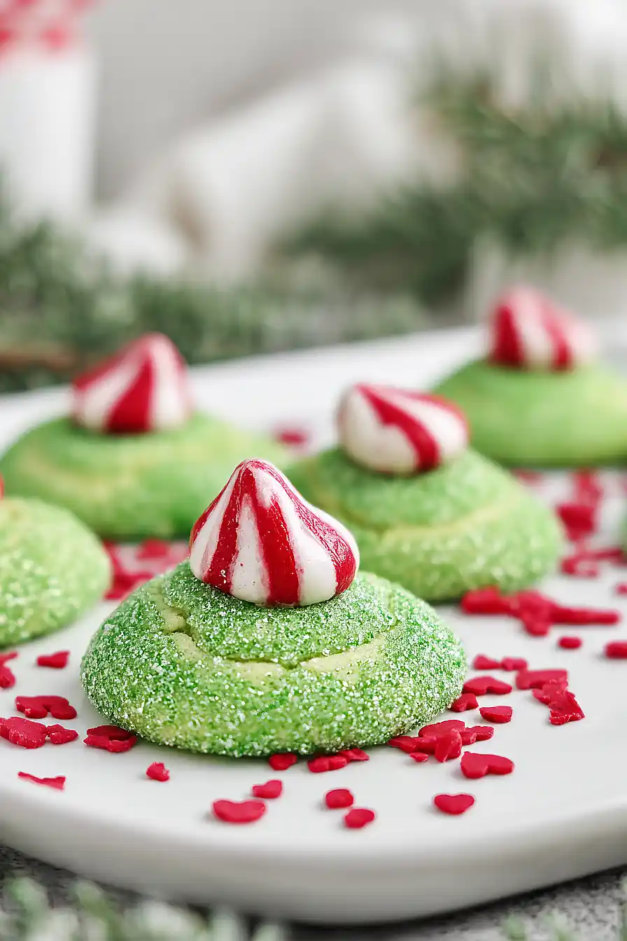 Here are my festive Grinch cookies with Hershey’s Kisses, featuring soft, chewy green cookies rolled in powdered sugar and topped with a red candy heart to complete the Grinch’s famous look.