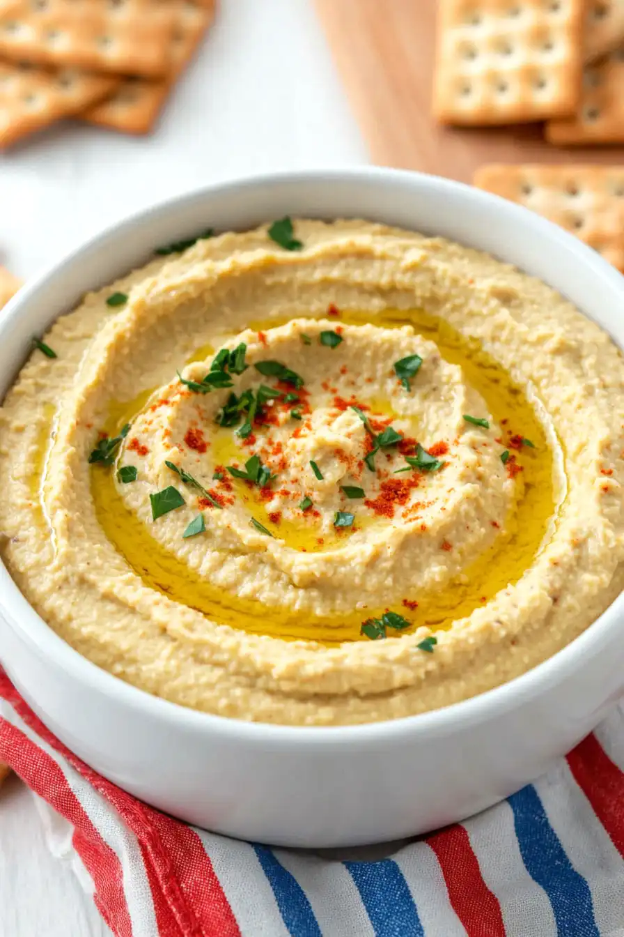 This homemade hummus makes a perfect centerpiece for a casual snack board or appetizer spread! For dipping, set out a colorful mix of fresh vegetables like carrot sticks, cucumber slices, bell pepper strips, and cherry tomatoes. Warm pita bread or pita chips are classic choices that everyone loves, while pretzel crisps and tortilla chips offer different textures and flavors for scooping. If you’re serving this as part of a larger Mediterranean-style meal, try pairing it with grilled chicken, falafel, or roasted vegetables – the creamy hummus works as both a dip and a sauce.