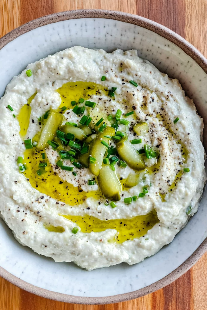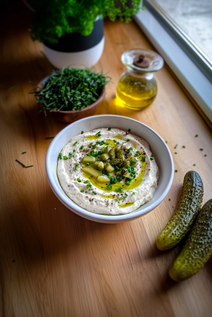 Garnish the dip with a drizzle of olive oil, more chopped pickles, chopped chives, and a sprinkle of black pepper for an added touch of flavor and presentation.