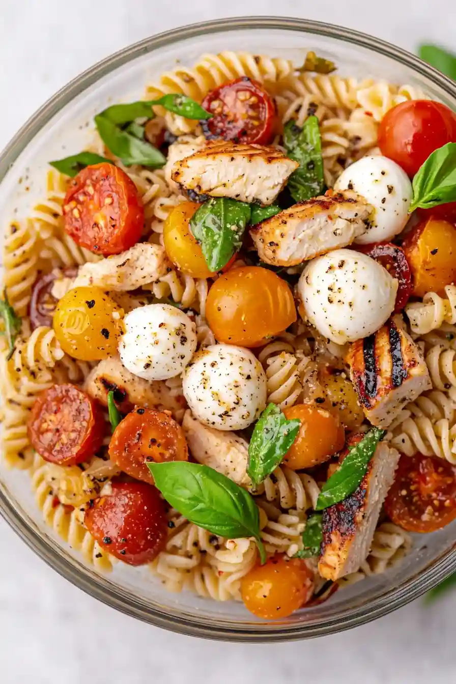 Make Ahead: Want to prep this in advance? Cook the pasta and chicken, then store them separately from the cut tomatoes, mozzarella, and basil. Keep the dressing in a separate container too. When you’re ready to eat, just toss everything together! This way, your ingredients stay fresh and the pasta doesn’t soak up all the dressing.