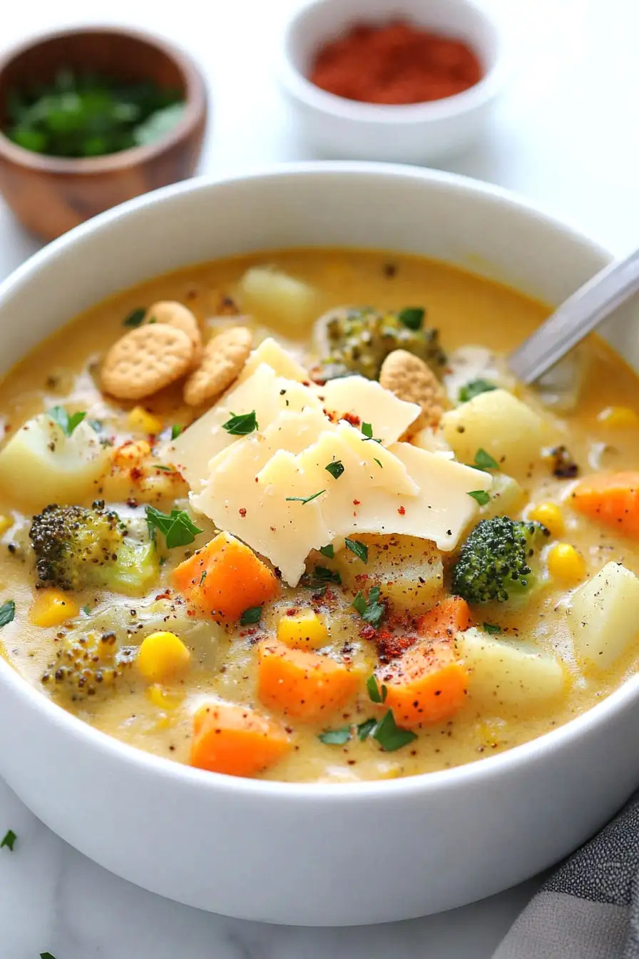 The biggest mistake when making vegetable soup is rushing the initial vegetable sautéing process – taking time to properly cook the onions, carrots, and celery until softened (about 8-10 minutes) builds a crucial flavor foundation for your soup. A common error is adding the flour directly to hot liquid, which can result in lumps – instead, stir the flour into the butter and vegetable mixture to create a smooth roux before slowly adding the broth. To keep your vegetables from turning mushy, add them in stages based on cooking time: start with potatoes, then add broccoli and corn in the last 5-7 minutes of cooking. For the creamiest results, gradually stir in the heavy cream and cheese over low heat at the very end, and don’t forget that final splash of balsamic vinegar which adds a subtle depth that makes all the difference.