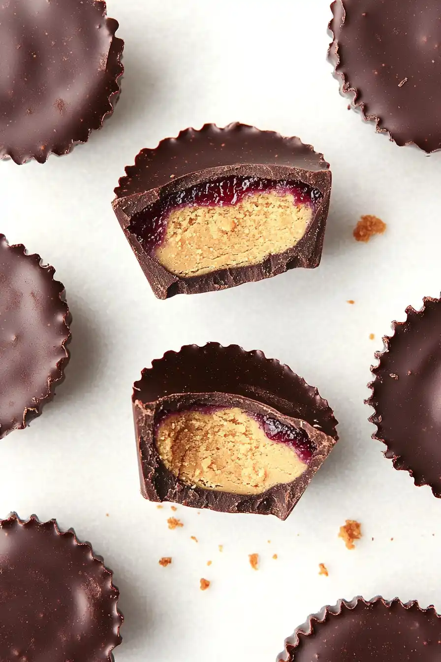 The biggest challenge when making peanut butter and jelly cups is working with chocolate that’s not properly tempered – if the chocolate is too hot, it won’t set properly and might develop a dull, streaky appearance. To avoid this, use a candy thermometer and keep your dark chocolate between 88-90°F (31-32°C) during the dipping process. Another common mistake is rushing the layering process – each chocolate layer needs to set completely in the refrigerator (about 10 minutes) before adding the peanut butter mixture or jelly, otherwise, your layers will mix together. For the smoothest results, make sure your peanut butter mixture is at room temperature when mixing with the powdered sugar, and gently warm your jam for easier spreading – but be careful not to make it too hot, or it will melt your chocolate layers. If you notice your chocolate starting to thicken while working, gently rewarm it over a double boiler, being careful not to exceed the tempering temperature.