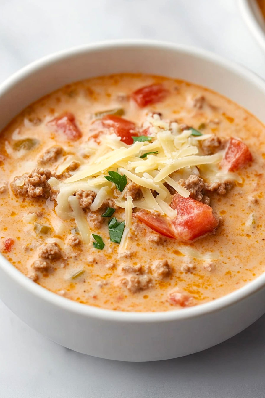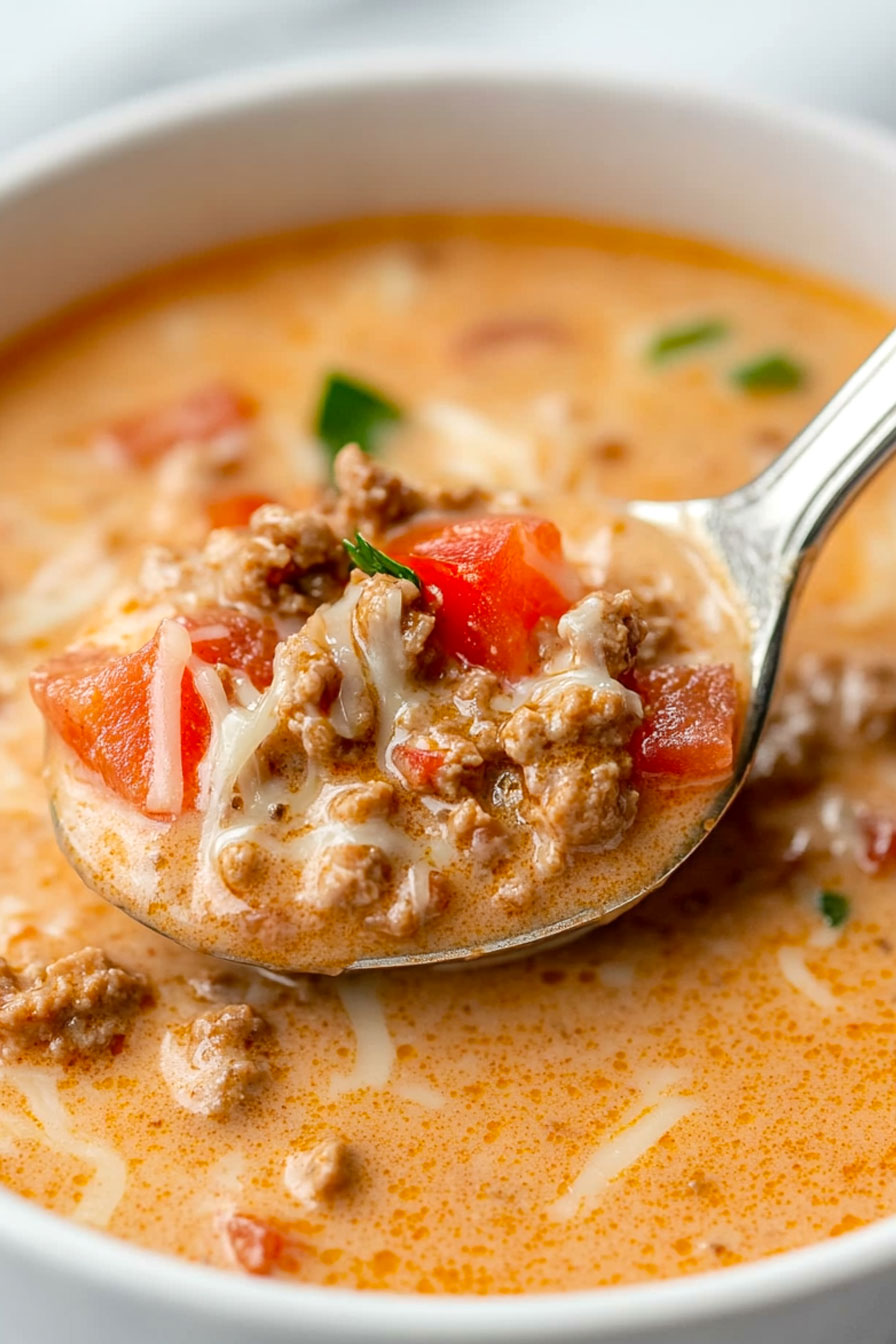 For the minced beef, ground turkey or chicken can be used as leaner alternatives, maintaining protein content while reducing saturated fat. Adjust cooking time as poultry may cook faster than beef. Vegetarian options include crumbled tempeh or textured vegetable protein (TVP), which offer similar texture and protein content. For cream cheese, Greek yogurt can be substituted to reduce fat and increase protein. Use slightly less yogurt and strain it if necessary to achieve a thicker consistency. Heavy cream can be replaced with unsweetened almond milk or coconut milk for a dairy-free version. These alternatives are lower in calories and fat, but may slightly alter the soup’s richness. Adjust the quantity to maintain desired thickness and add a small amount of coconut oil if a richer mouthfeel is needed.