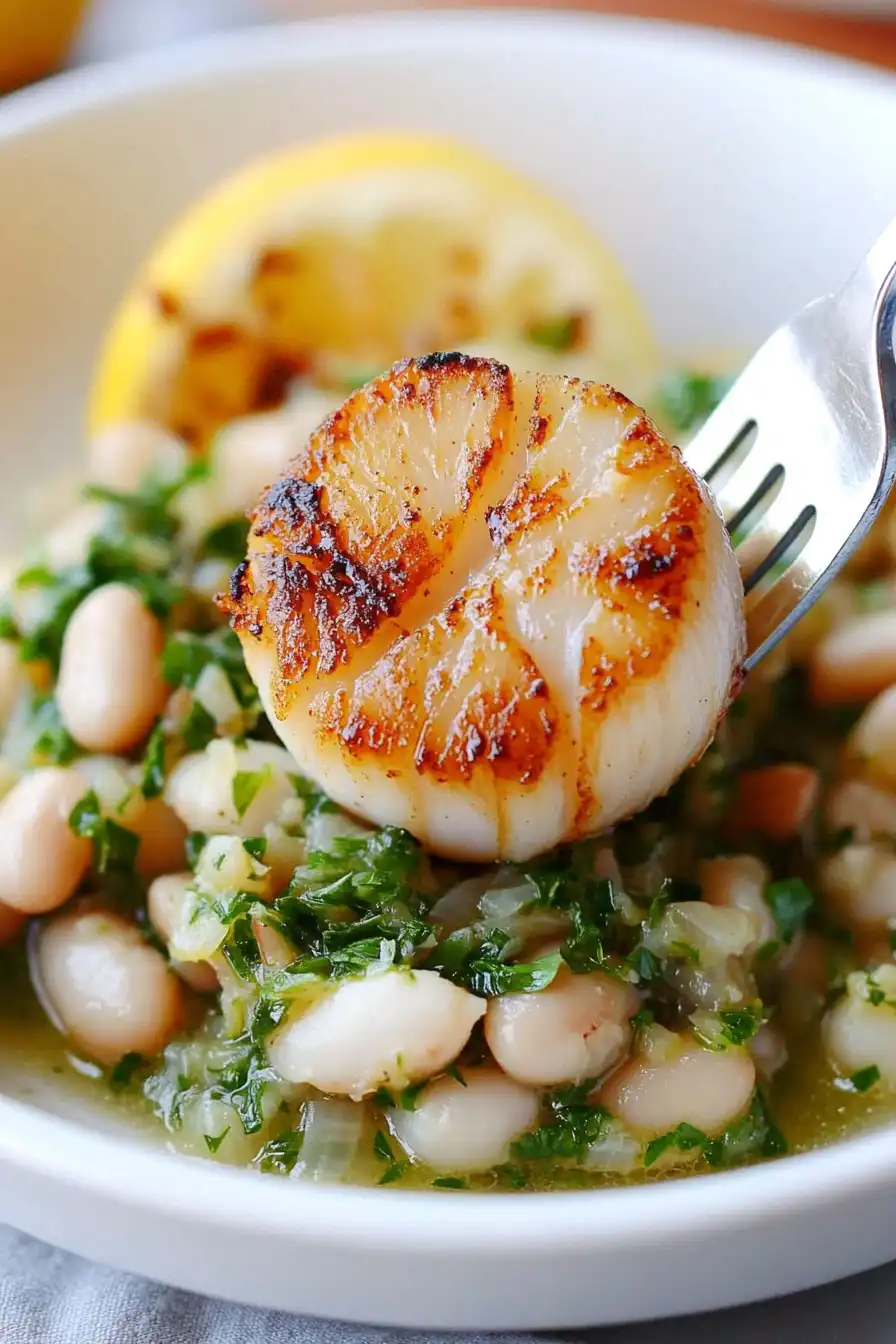 Serve immediately while hot, enjoying the combination of tender scallops, hearty beans, and flavorful sauce.