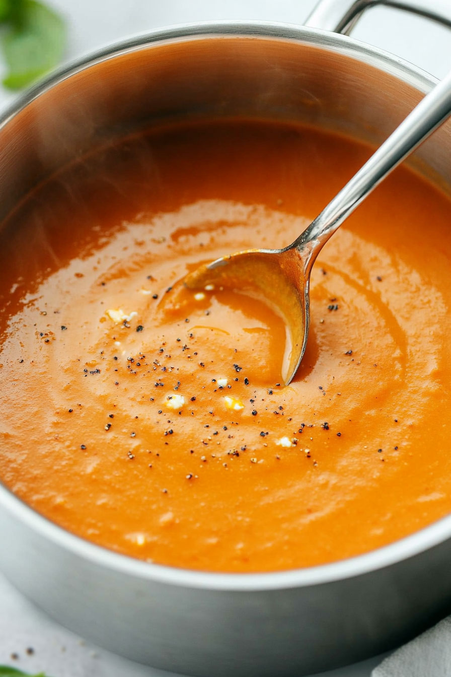 Serve the soup warm, and enjoy the rich and creamy texture enhanced by the flavors of the tomatoes and herbs.